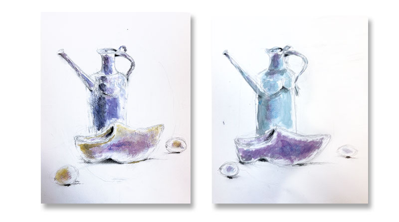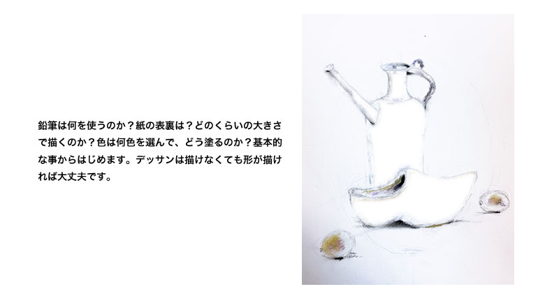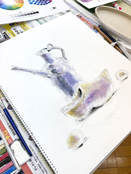 お友達同士で絵を習いに来られて今日が初日。ふたりとも絵を描くのは学生以来で絵を習うのははじめてのこと。月2回の授業の一日目、普段はそんなにリクエストを出す事はありませんが、最初なので要所要所、ポイントをお伝えしながら制作、2時間位ですが全体的な雰囲気ができてきました。