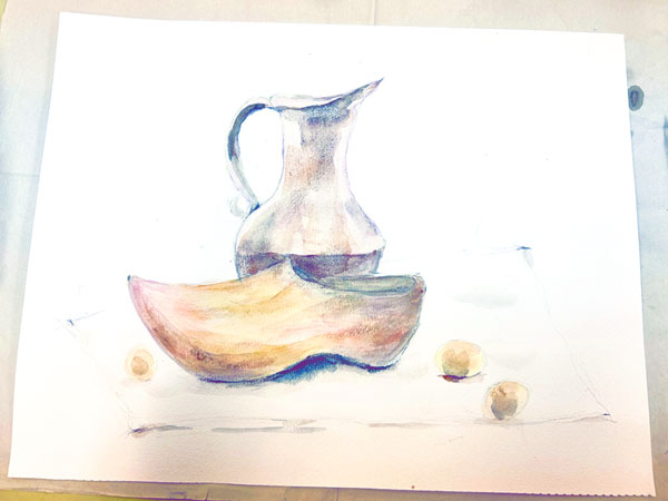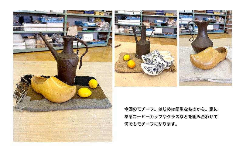 お友達同士で絵を習いに来られて今日が初日。ふたりとも絵を描くのは学生以来で絵を習うのははじめてのこと。月2回の授業の一日目、普段はそんなにリクエストを出す事はありませんが、最初なので要所要所、ポイントをお伝えしながら制作、2時間位ですが全体的な雰囲気ができてきました。